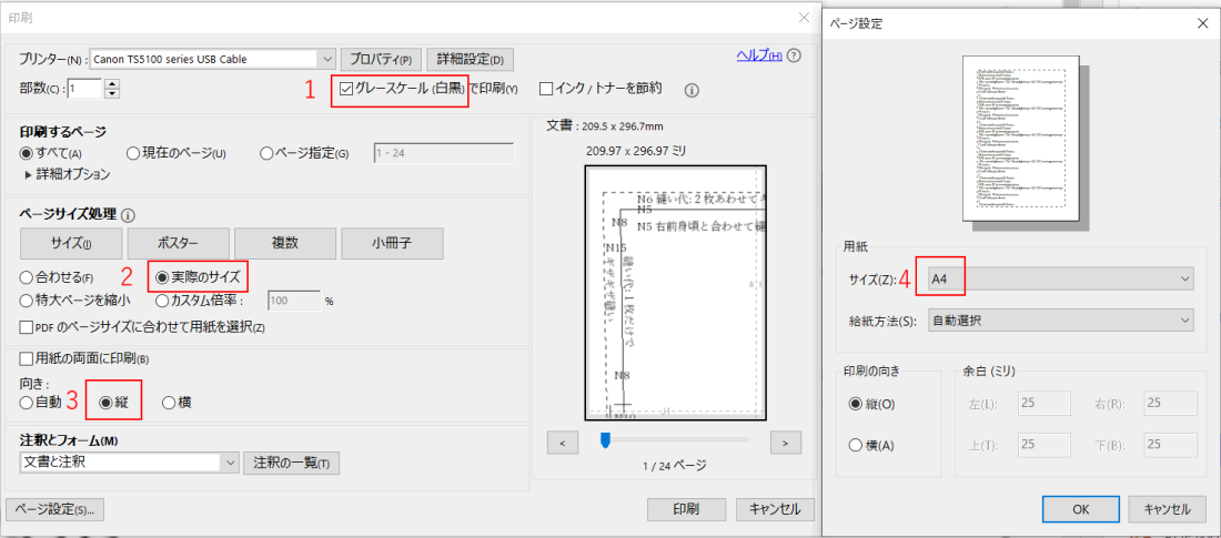 正しいサイズで印刷するため、印刷の際は下記のポイントに気を付けます。